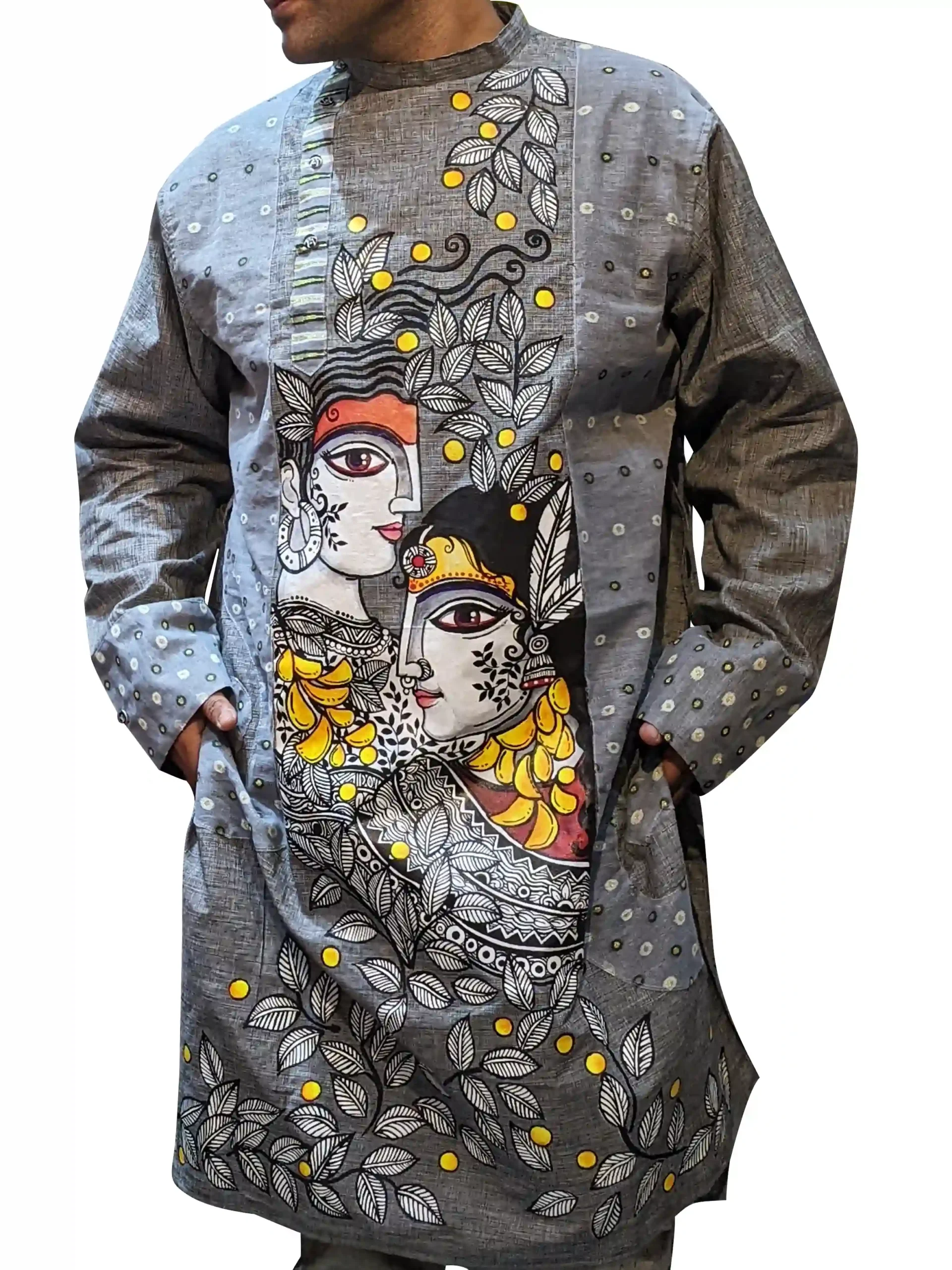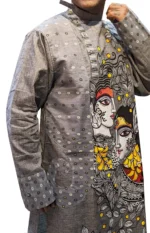 • This gray premium cotton long kurta Panjabi, painted with a beautiful and unique Radhe-Krishna concept and “Tant” patch work at both sides.