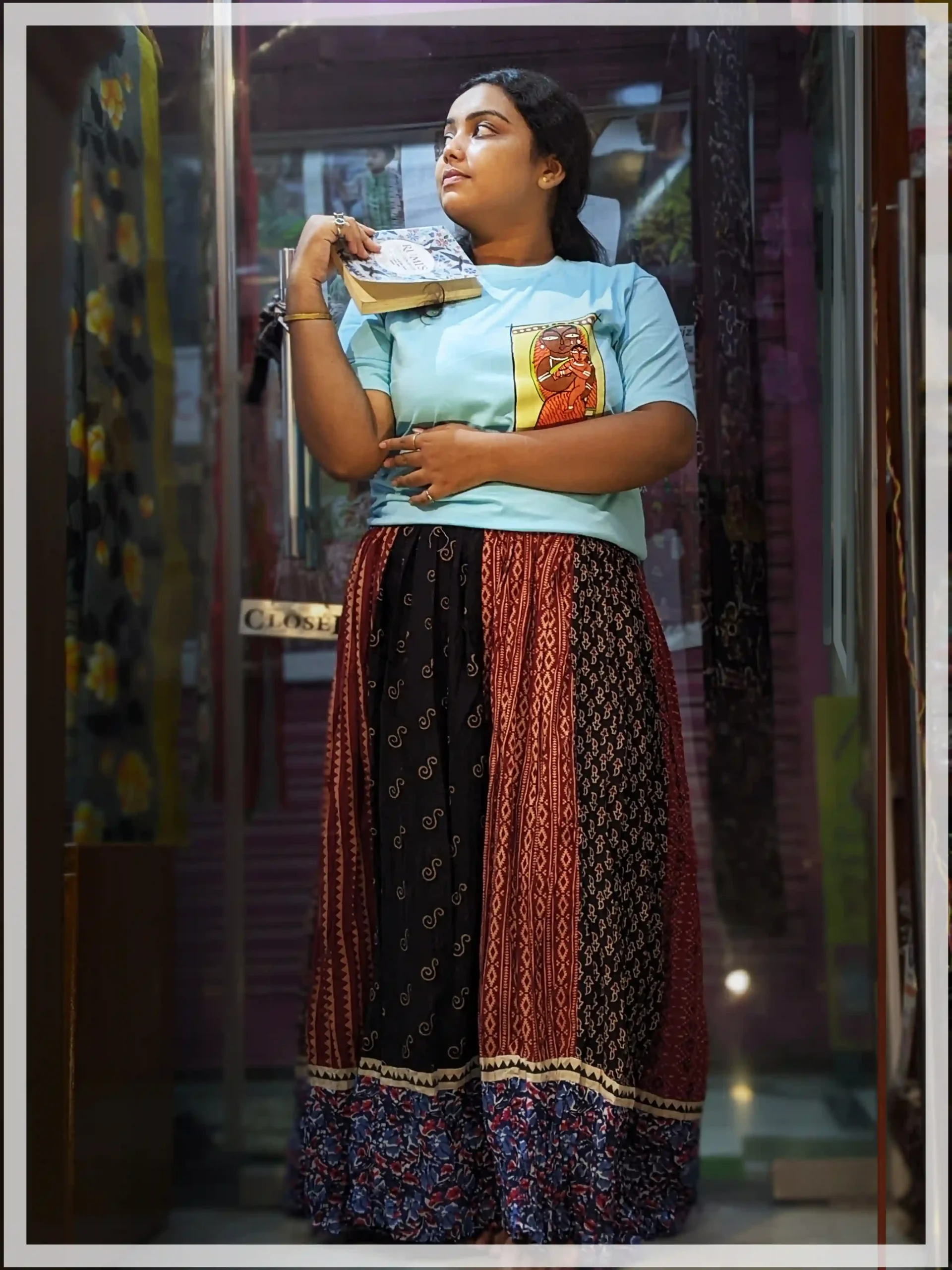 #Comfortable pure cotton hand painted t shirt with Ajrakh mix-match skirt